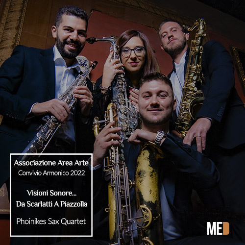 L’ Associazione Area Arte per Convivio Armonico ci offre il concerto “Visioni Sonore…Da Scarlatti A Piazzolla” con il Phoinikes Sax Quartet – vincitori del REATE Festival 2021 (Premio Speciale Città di Rieti) formato da Matteo Di Giuliani sax soprano, Luigina Battisti sax alt, Danilo Coltella sax tenore, Luca D’angeli sax baritono. Omaggio alla Scuola Napoletana con nuove trascrizioni per il quartetto di opere di Domenico Scarlatti e Domenico Cimarosa in un programma che si slancia poi nel contemporaneo con Iturralde, Di Cosimo, Stracchi, Molinelli, e Piazzolla.