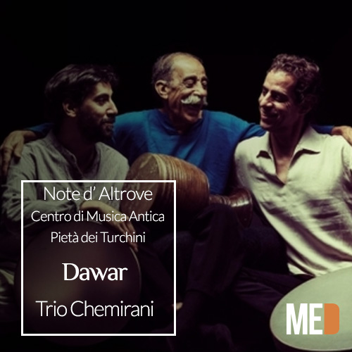 Per Note d’ Altrove, la stagione musicale di Pietà dei Turchini le sonorità mediorientali del trio Chemirani formato da Djamchid Chemirani e i suoi due figli Bijan e Keyvan, impegnati con lo Zarb, il classico tamburo persiano, uno dei principali strumenti di percussione del Medio Oriente,  considerato anche uno strumento melodico, con tante note come un pianoforte, le combinazioni tra melodia e ritmo sono infinite.