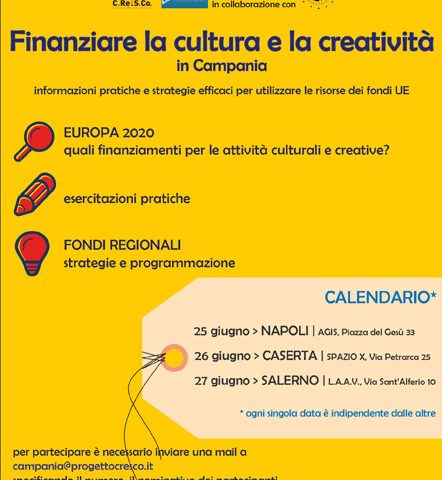 Il 25 giugno presso la sede dell’ Agis Campania a Napoli parte Finanziare La Cultura E La Creatività In Campania il primo workshop che si interroga sul come utilizzare le risorse dei Fondi UE (Europei, Nazionali e Regionali), sul metodo della ricerca dei bandi e sulla programmazione dei fondi della Regione Campania.